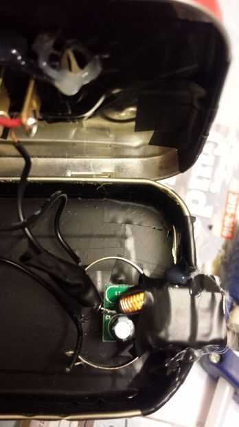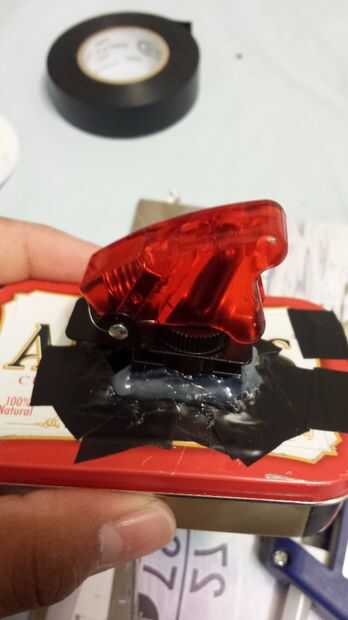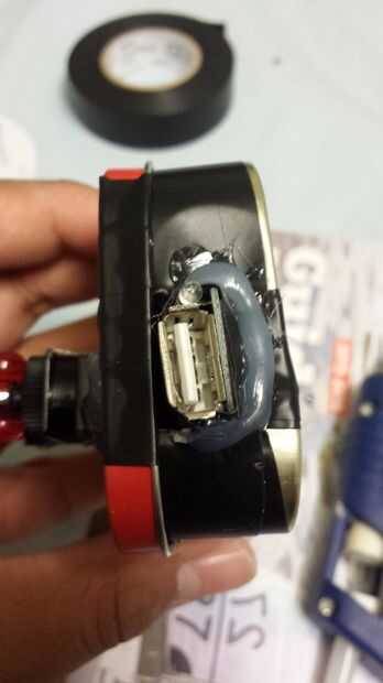 Tire todos los componentes a través de uno de los orificios (uno que es más grande). Una vez que cada cosa está dentro de la caja utilice pegamento caliente para fijar el interruptor y el USB en el agujero.