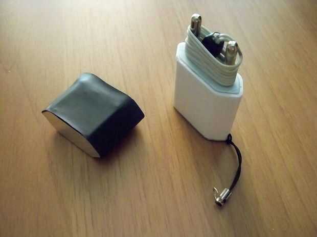 Pude instalar un cable de 30cm a mi cargador (cortada de un viejo cable de pc IDE y soldado a un conector macho usb micro) pero también puedes probar otros tipos de cables (watchout de 1 amperio del cargador). Además va a la conexión de C4 D2 y menos para el puente que hemos añadido. Después de cortar la caja de plástico del cargador del iphone con el dremel, utilice 1mm PVC y aluminio u otro tipo de cinta, para lograr un resultado más suave. Añadir una correa a su cargador y hay que ir, tienes un cargador portátil que mide 52 x 35 x 14 milímetros y tiene un alambre de 30 cm.
