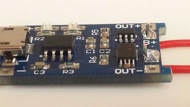 Introducir y soldar los cables dos de 2,5 pulgadas a los bornes B + y B-de la "mesa de carga de Mp1405". Cada uno de estos cables se conectarán a sus respectivos contactos positivos y negativos de la batería. El "tablero de carga de Mp1405" es lo que se utilizará para cargar la batería del teléfono celular y alimente de la batería el "DC módulo convertidor de paso para arriba". El conector Micro-USB en el "tablero de carga de Mp1405" se utilizará para cargar la batería interna del cargador portátil.