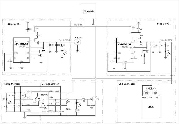 Módulo de TEG se romperá si temperatura superior a los 350 º c en el lado caliente o 180 º c en el lado frío. Para advertir al usuario construí a un monitor de temperatura ajustable. Se encenderá un LED rojo si la temperatura alcanza un cierto límite que se puede establecer como usted tiene gusto.