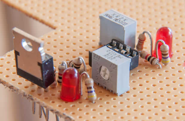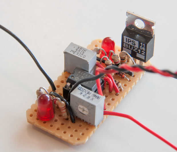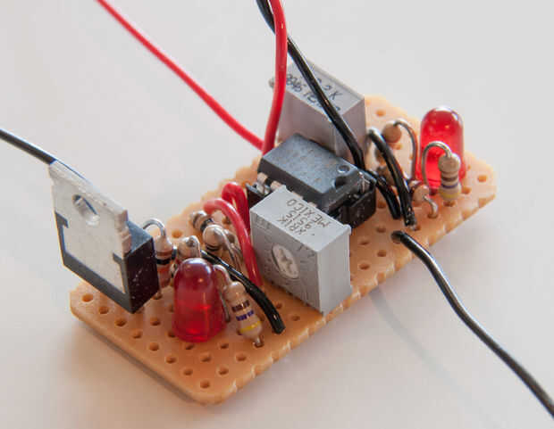Es mucho más fácil. A alimentar el circuito con tensión límite que desee y gire P3 hasta que el LED se enciende. Asegúrese de que la corriente no es demasiado alta en T1 o se quemaría! Tal vez usar otro pequeño disipador de calor. Funciona del mismo modo que el monitor de temperatura. Cuando el voltaje sobre el Diodo zener aumenta por encima de 4.7V caerá la tensión PIN6. La tensión al PIN5 determinará cuando se activa el PIN7.