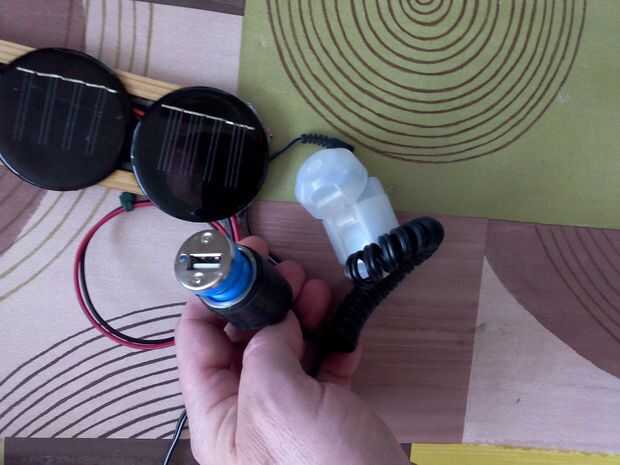 necesita algunos mini panel solar (6 x 2,3 voltios), un usb 12 voltios de coche cigarrillos adaptador, un cable simplemente, pegamento, algo de madera...