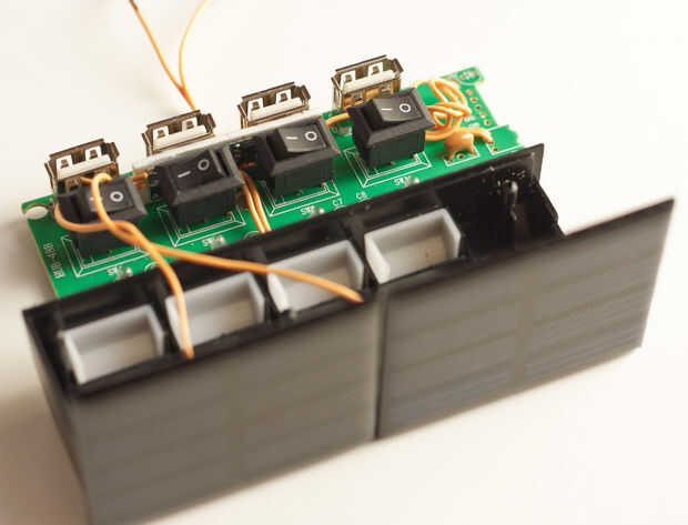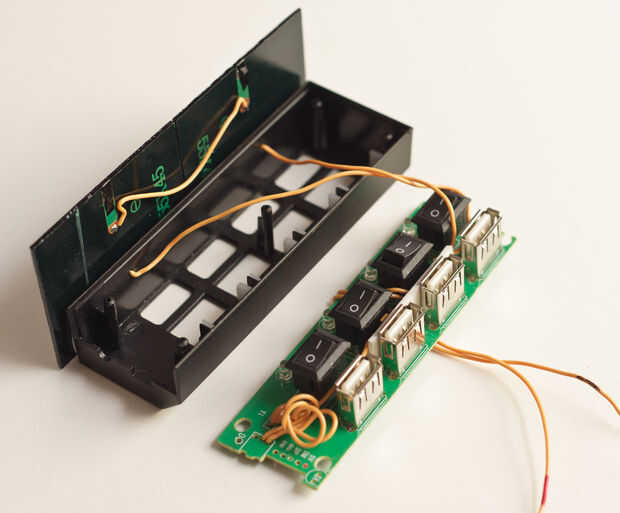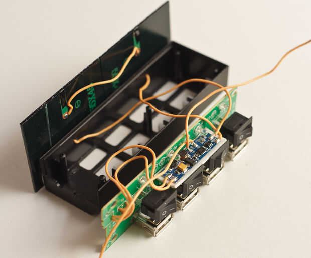 Ahora buscar un lugar donde poner el pcb... Pensé que era más sencillo, que he tenido que cambiar tres posiciones diferentes. Cerrar la tapa de la placa presionada contra los componentes. Finalmente encontré la mejor posición entre los interruptores y enchufes USB. Una cinta de doble cara evitar el pcb toques el metal de las tomas. Antes de que cierre no olvide poder blando el dispositivo como expliqué antes.
