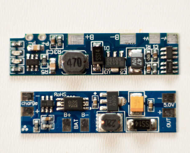 En este instructable ves dos PCB similares, uno tiene dos indicadores de carga (led rojo) de procesos y carga (led verde) completa, otro no tiene LED y es un poco más barato. Ambos pretenden cobrar una sola célula, aunque en teoría se pueden conectar dos celdas en paralelo, pero no lo sugiero ya reducirá su vida. También ambos proporcionan + 5V de la salida.