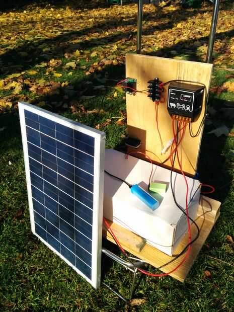He utilizado las pilas de una copia de seguridad de energía de la computadora (UPS) así que el coste es nulo. Carro de equipaje, madera de desecho, etc..