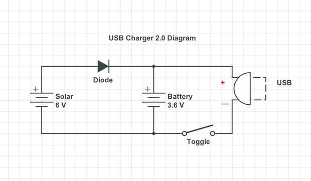 Es un diagrama del circuito para este proyecto. Está diseñado para que la célula solar siempre se carga de las baterías y el interruptor de palanca activa el circuito USB encendido. Un diodo se ha puesto en lugar para evitar que la electricidad fluya en la dirección equivocada en la célula solar. Este es un diseño muy común para cargadores solares.