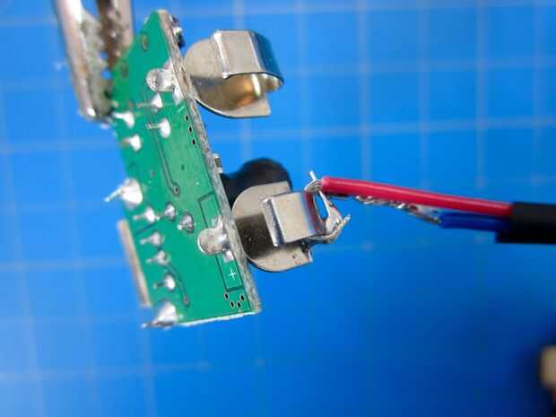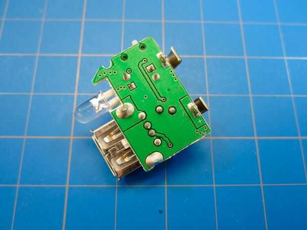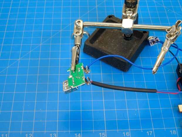 El circuito en nuestro kit tiene lengüetas de metal saliendo de la Junta que se suelde los cables a. Si has encontrado tu propio circuito de carga USB puede tener a través de agujero.
