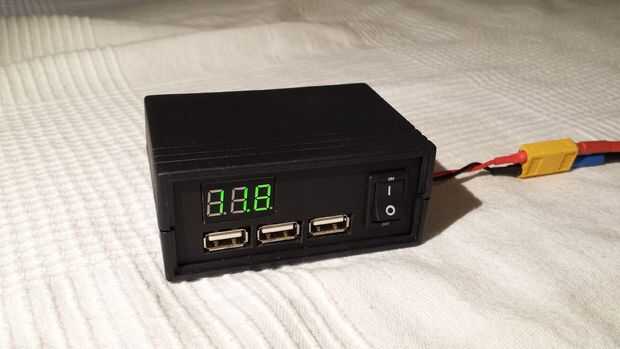 Este cargador puede ser alimentado por prácticamente cualquier fuente de 7V a 30V y puede suministrar corriente de carga USB 3A. Estoy alimentando de 3S (11.1V) de LiPo, pero también debe ir de 2S (7.4V) LiPo, baterías de coche (12V y 24V) e incluso paneles solares.