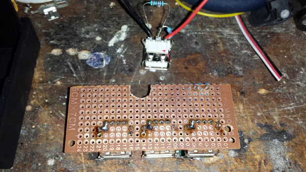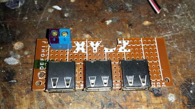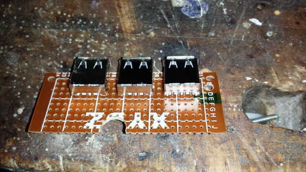 Este es un paso bastante fácil. Sólo perforar un poco más grandes para las lengüetas de los conectores USB, empujarlos y soldarlos en el lugar. Luego soldar entre sí lo GND (pin 4) y el caso del conector para cada conector.