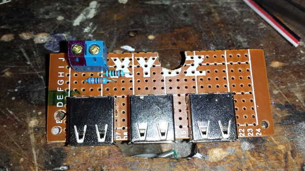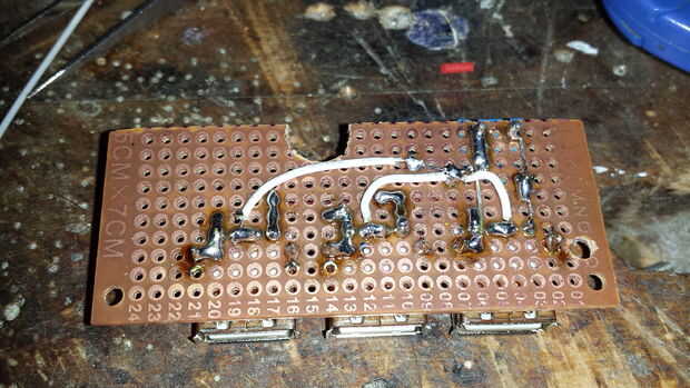 Paso siguiente es soldar los carriles de la energía. Conecte las clavijas de tornillo para el primer conector USB. Luego utilice un cable para conectar a todos los + 5V pernos juntos y todos los pines GND juntos, prestando constante atención a la polaridad y cualquier corto. El alambre que he usado aquí es 26AWG, que no es lo ideal - se debe utilizar por lo menos 22AWG.