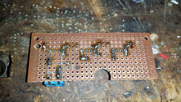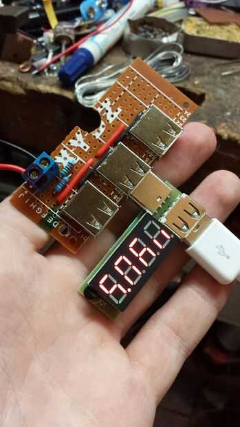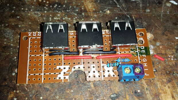 Después de comprobar (¡ otra vez!) todos los voltajes, polaridad y corto, usted puede ahora encienda de un banco de alimentación a 5V. Mida el voltaje en los pines de datos USB, se debe Lee unos 1.2V. Si no, compruebe el cableado nuevo... de lo contrario puede tratar de cargar un teléfono.