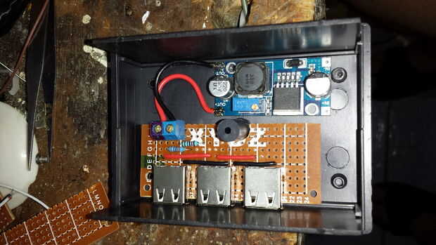 Tenemos que preparar el convertidor de DC-DC reductor. A soldar unos cables a los terminales de salida. Utilizar alambre más grueso (menos 20AWG), utilicé alambre desde un equipo fuente de alimentación.