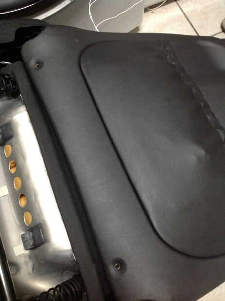 Quitar el panel trasero.  Ver si tienes espacio para encajar el adaptador del cigarrillo en la cavidad del asiento.  Puede que necesite quitar algunos materiales de la espuma.  Escojo mis más arriba, justo debajo del soporte de cabeza.