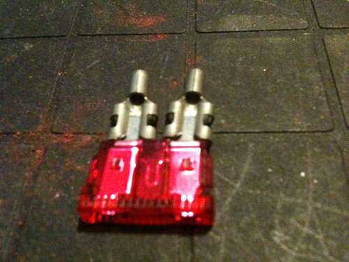 Engrasar las cuchillas de los fusibles y me ponga el conector hembra cuchilla sobre el fusible, colocado el fusible en la ranura corte en la caja y aplicar el plástico en el interior. Una vez que el plástico se endurezca he quitado el fusible y ahora tiene un portafusible en línea. Después de que lo hice me di cuenta de debo haber soldado los cables a los conectores hembra hoja primero... bueno yo trabajo realizado.