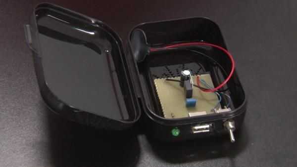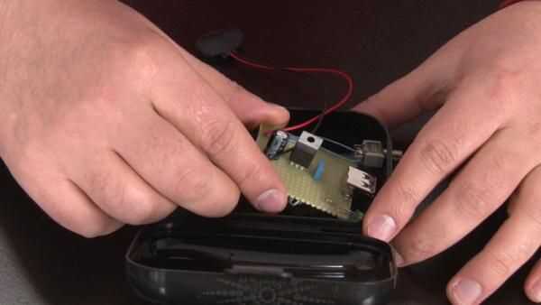 Después de abrir los agujeros del tamaño requerido, la Asamblea se coloca dentro del contenedor. Con un poco de pegamento caliente, mantenga la placa y prohibió las aberturas. Para asegurar la batería en su lugar, podemos utilizar una cinta de doble cara, pero esto es opcional.