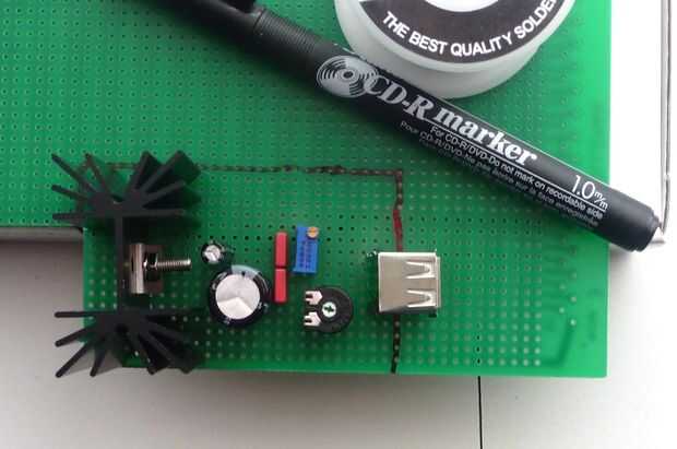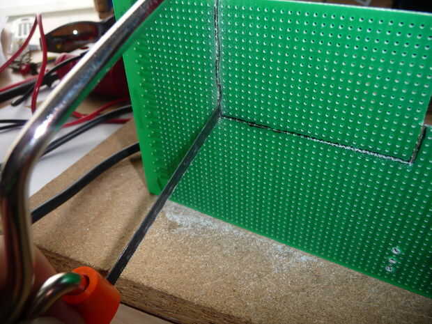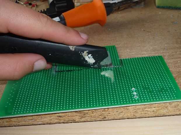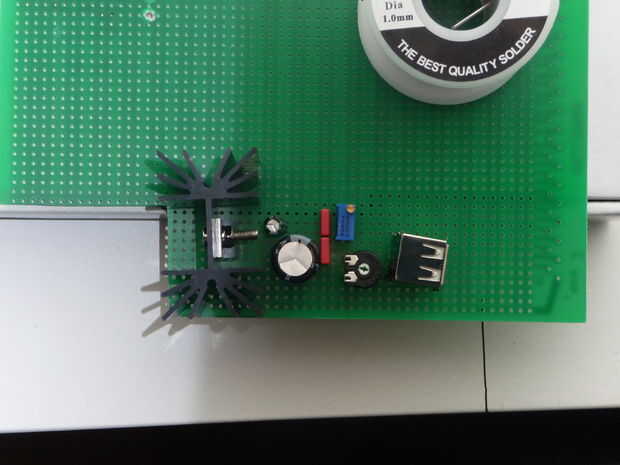 Nos se Sierra de la pieza que necesitamos. Para ello, perno abajo su zona 7805 a su disipador de calor. No aplique pasta de refrigeración aún! Cuando hayas hecho esto, coloque todos los componentes en el pcb. Cuando hayas hecho esto, tomar una foto de su trazado. Luego, tomar un marcador y dibujar una línea alrededor de la pieza que usted necesite. Después de eso, saque los componentes y vio la placa.
