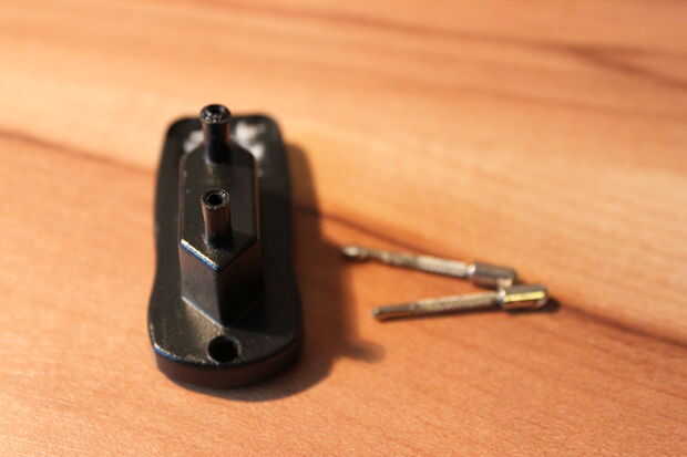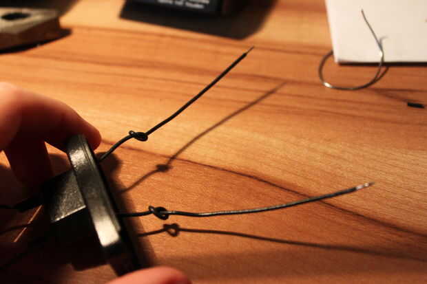 Si desea utilizar el enchufe del adaptador de alimentación como se muestra en la última foto, basta con retirar los remaches con un par de pinzas. Ahora puede enhebrar los extremos del cable gratis a través de los agujeros. Para evitar cualquier tracción sobre la soldadura juntas haga un nudo en cada hilo como se muestra en el cuadro 4.