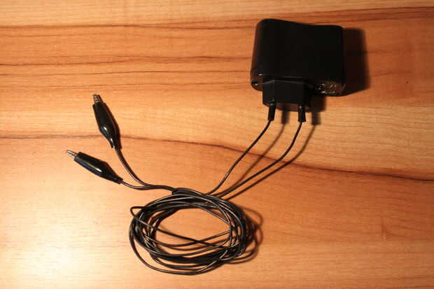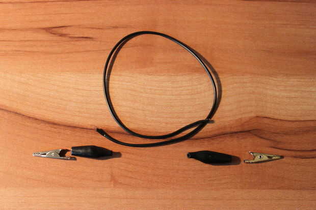 Um die Krokoklemmen von den kurzen Kabeln zu entfernen, müssen die Schutzhüllen erst einmal abgezogen werden, damit die de hombre Klammern ablöten kann. Dann schneidet man sich zwei Kabel mit je 1 m Länge ab und lötet die Klammern un je ein Ende. Schutzhüllen wieder aufbringen.