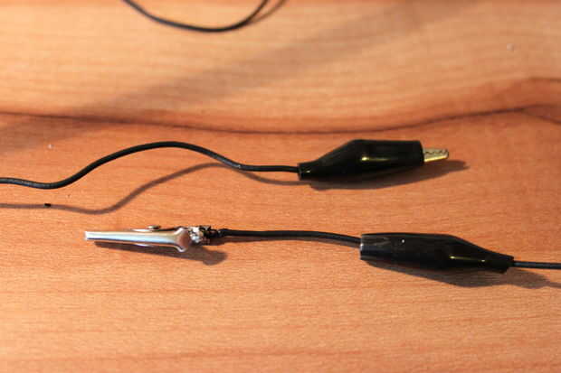 El siguiente paso es cortar dos cables de 1m y soldar una pinza a cada uno. No olvide poner la cubierta protectora.