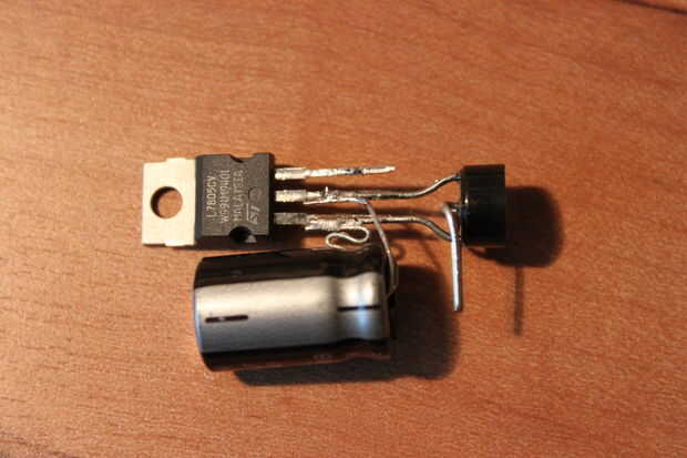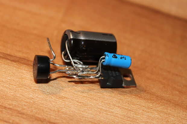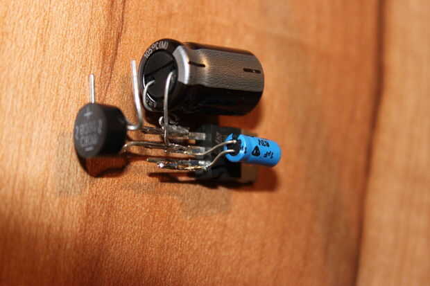 Der Pluspol des 220 μF Kondensators wird un den linken Pin und der Pluspol des 0,1 μF Kondensators un den rechten Pin des Spannungsreglers gelötet.