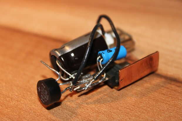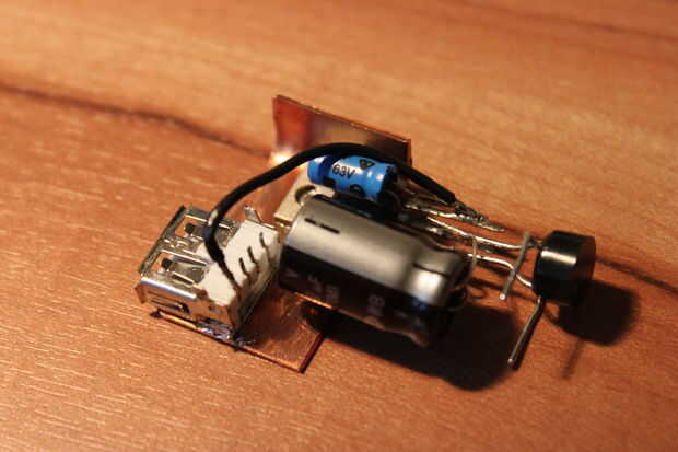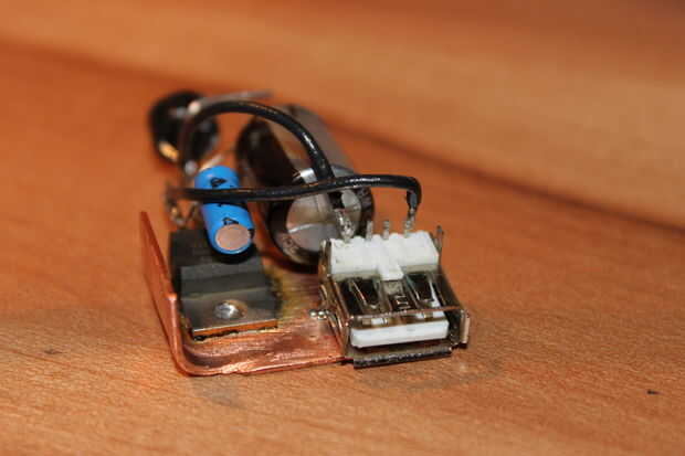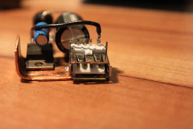 Soy vorne gesehen der Pluspol de USB-Stecker ist ganz rechts von. Dieser wird mit dem rechten Pin des Spannungsreglers über la ein Stück isoliertes verbunden Kabel.