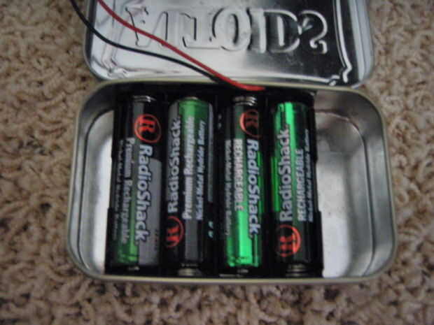 Dentro de las conocida altoids lata mentiras tres 2.200 mah baterías de iones de litio. Los tres se corrió en paralelo para crear una batería de 6.6 amp o 6.600 mah. Que triplica el tiempo de carga! Si una batería puede cargar su teléfono 75 por cien