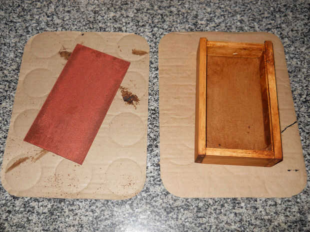 La parte superior de este cuadro es una pieza débil del tablero de la fibra. Incluso manchados, no parece muy bueno, así que decidí pintarlo en su lugar. Primero probé una capa de cobre metálico y no estaba satisfecho con los resultados, por lo que cubrí el cobre con una capa de oro metálico.