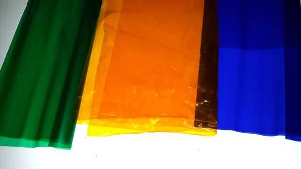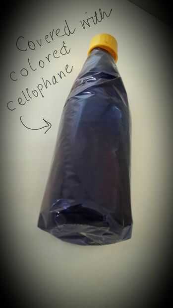 2) coloreado celofán - azul/verde/amarillo (en caso de que no tienes una botella de vidrio coloreado. Envolver la botella claro en la elección de celofán - una sola hoja doblada)