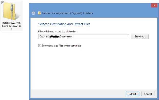 Ahora que MPIDE ha sido instalado, puede extraer el archivo ZIP a su lugar de preferencia (recomiendo documentos). Todo lo que se extrae es un poco mas de un GB de memoria, así que no te preocupes si tarda unos minutos.