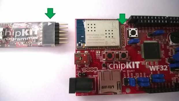 En el chipKIT PGM se puede ver que hay una flecha blanca al lado de uno de los pines, que es el pin 1. En WF32, puede ver en la ubicación de JP2 hay 6 conectores con 1 tener un borde cuadrado en lugar de círculo, que es el conector 1.