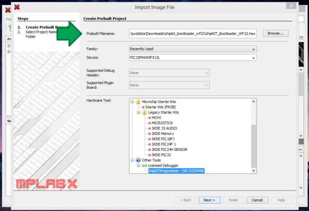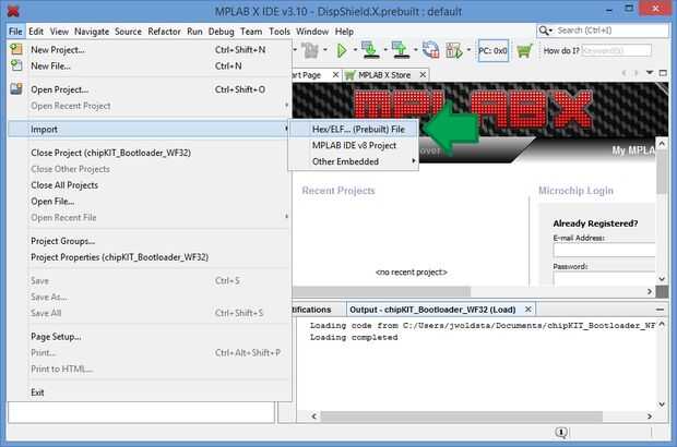 Ahora queremos importar el archivo HEX. Haga clic en el botón importar en el lado izquierdo y haga clic en el archivo HEX/ELF preconstruidos. Esto le llevará a una página nueva. Haga clic en examinar y busque el archivo que descargaste.