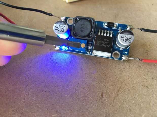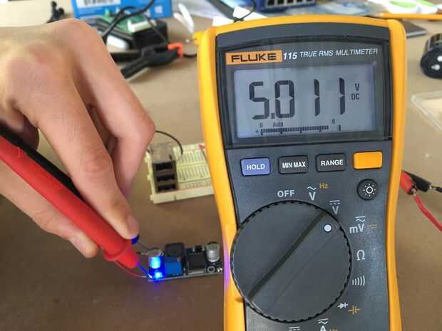 Para calibrar el convertidor DC/DC, conectar los cables de entrada del convertidor para su alimentación. Ajustar la tensión de entre 10 y 18v y encienda la fuente de alimentación. Debe iluminarse el LED azul a bordo. Agarra tu multímetro y un destornillador común y gire el tornillo de latón en el potenciómetro de ajuste azul hasta la salida de Lee 5.2v! La imagen muestra 5.011v y después de probar extensa, he encontrado que para ser un voltaje demasiado bajo para conseguir el teléfono para cargar. El apple pequeños cubo cargador carga en 5.2v también así que es perfectamente seguro.