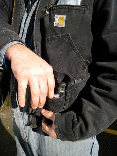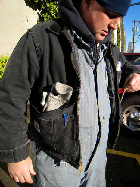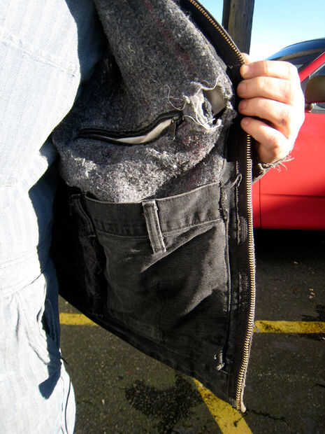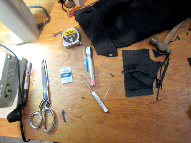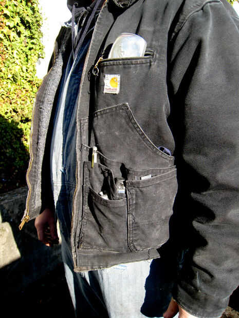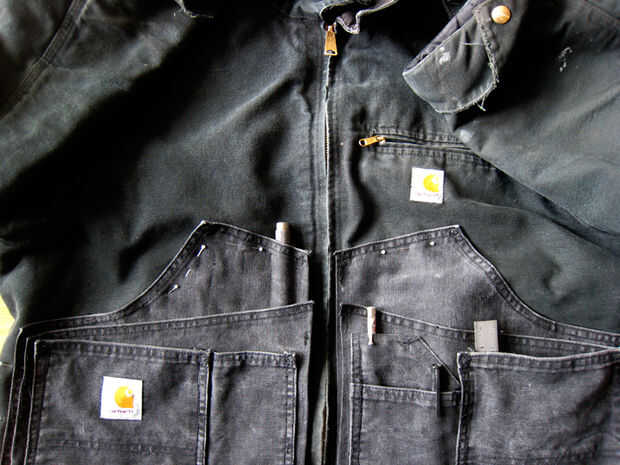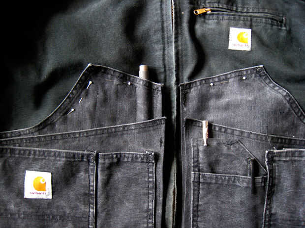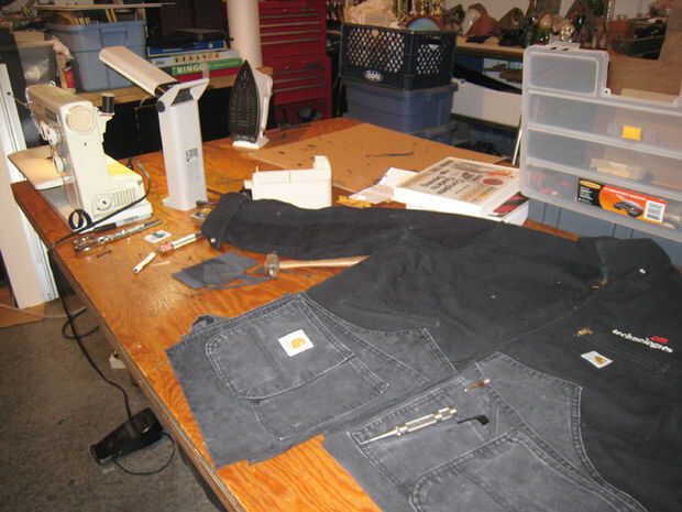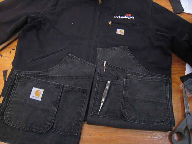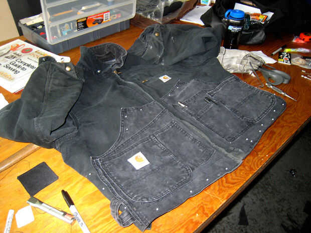 Trabajo como un fabricante de escultura y quería una capa que podría duplicarse como un portátil "mini caja de herramientas", capaz de sostener algunas de las herramientas tomo sobre una base regular. Cosas como cinta métrica, escriba, auto-punch, pero también guantes, anteojos de seguridad y botella pequeña de agua y té. Tuve un repuesto chaqueta Carhartt Detroit y una parte de los pantalones frente a la doble de Carhartt. Corté los pantalones a los bolsillos, sino también cortar el blindaje frontal del muslo (no sé qué llamarlo) que me dio la forma de chevron os adjunto algunos de los bolsillos para. Cortar piezas a menudo tratando de mantener las costuras nativas intacta para no tener que crear los bordes, o plana talados pasajes en los bolsillos. De lo contrario sólo el borde doblado sobre y cosido lejos.