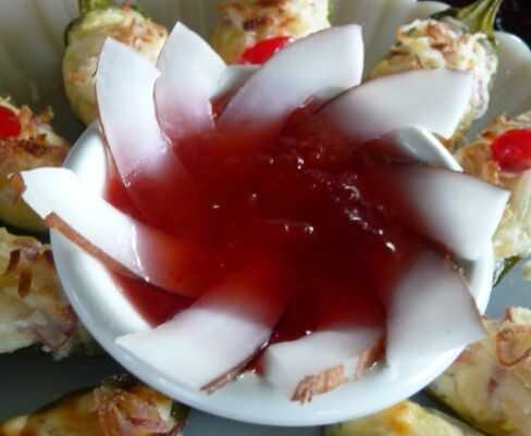 Si tienes trozos de coco, muy bien! Se ven tan bonito cerco la taza de la salsa y también son crunchie-munchie saludable además de este aperitivo.