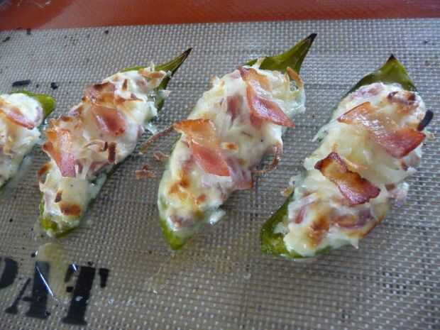Si te gusta bacon, ahora el tiempo para añadir unas pocas piezas en la parte superior. Tocino rebanado fino cocina muy bien para el tiempo y la temperatura utilizada en esta receta. Si usas tocino grueso, remojarlo el microondas por un par de minutos antes de rellenar los Poppers.