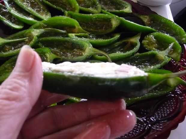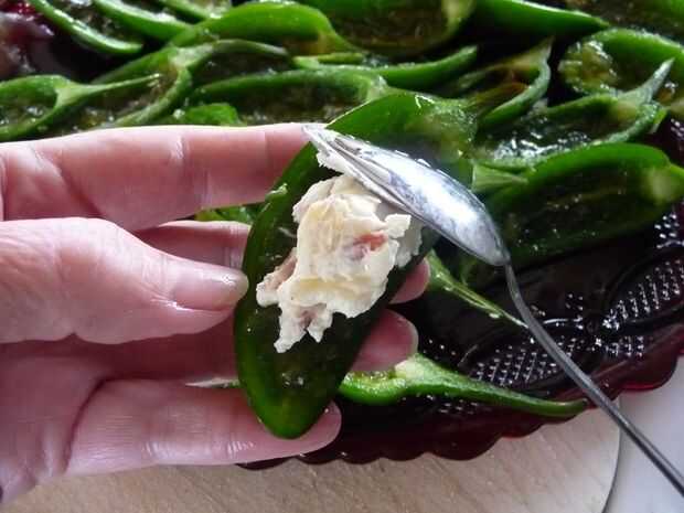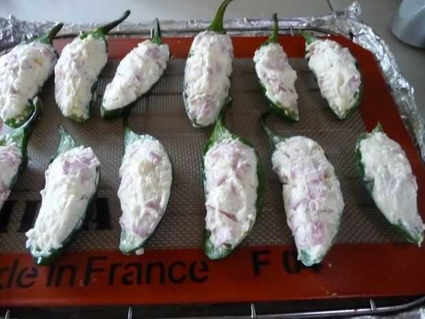Coloque una cucharada colmada de la mezcla de queso crema en cada cáscara de Chile Jalapeño, formando una cima ligeramente redondeado, con montículos. Repita hasta que todos los jalapeños están llenos.