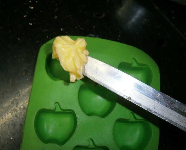 Llenar los moldes con mantequilla, utilizando una espátula para trabajar. Trate de asegurarse de que no hay ningún bolsillos de aire entre la mantequilla y el pan.