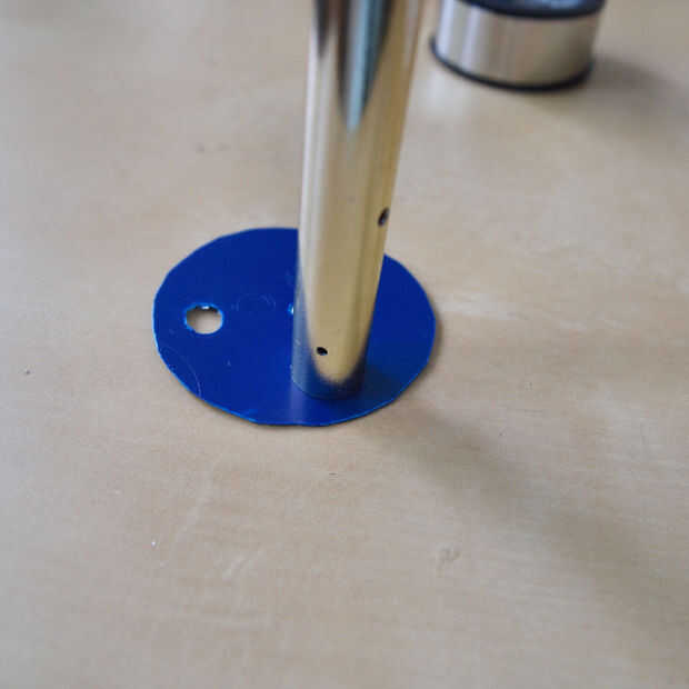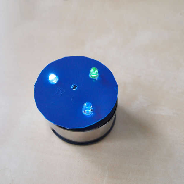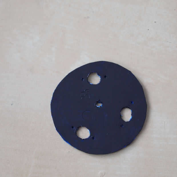 Ya que todo esta cinta que he estado usando parece realmente desordenada hice una funda para poner sobre él.  Esto es también para protegerlo de las inclemencias del tiempo.  Cortar un círculo de una tapa de plástico.  Corte tres agujeros para que los LEDS y agujeros más pequeños asomó uno a cada lado de éstos para la cadena atar las varillas de metal. Había coloreado el plástico negro que correspondería con el resto de la carcasa del foco. Necesitaba también un agujero en el centro de la cadena de los granos y colector de viento.