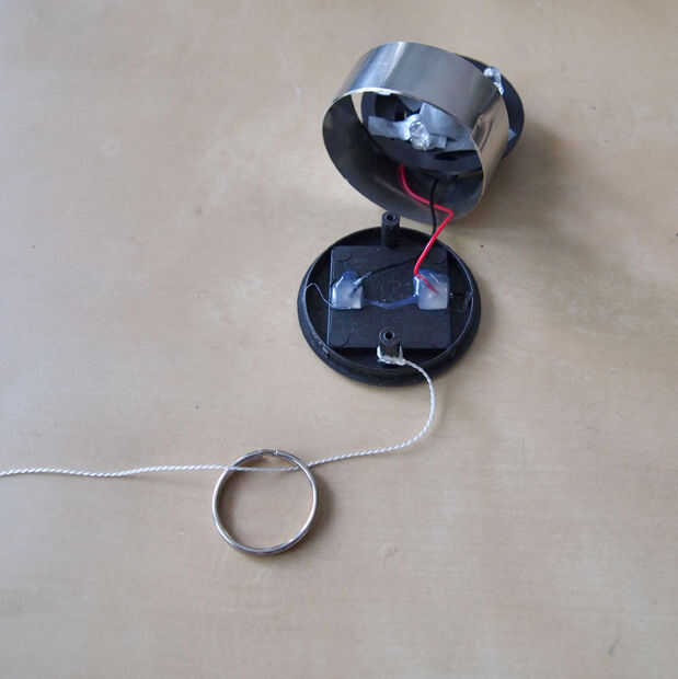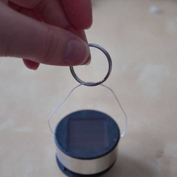 os adjunto cadena a la parte superior de la luz solar para una suspensión.   Até la cuerda a las dos perillas donde los tornillos y en un llavero ha añadido a la cadena para colgar.
