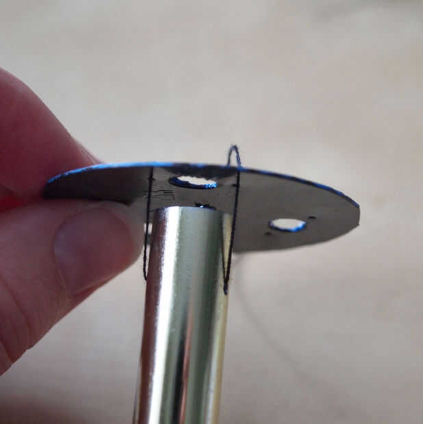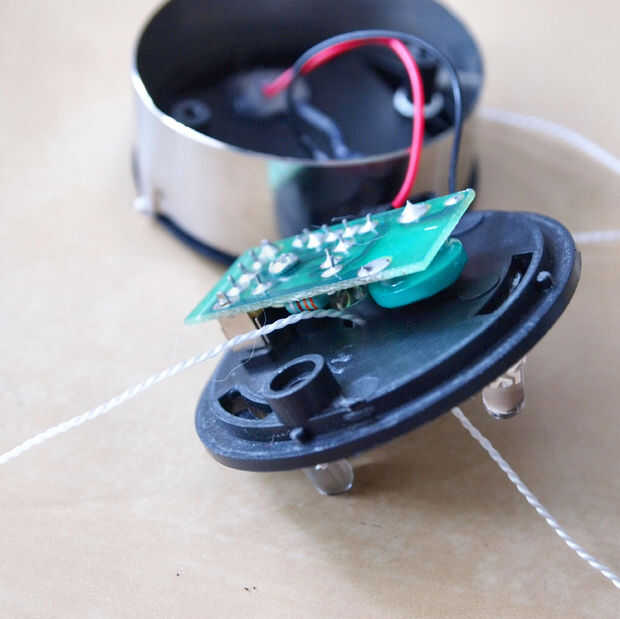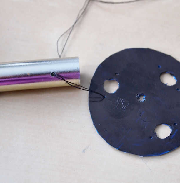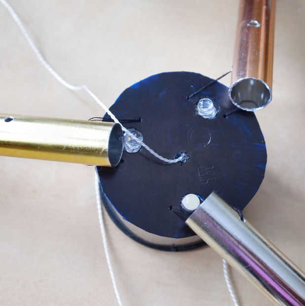 os adjunto las varillas de metal para la tapa de plástico con una cuerda a cada lado del agujero LED.  La barra se encuentra sobre un medio centímetro abajo para permitir que se haga pivotar libremente.  También de rosca una cadena más gruesa por el centro de la caja de luz solar (a través del orificio original el LED) y a través de la tapa de plástico.  Aseguró con cinta en el interior de la vivienda de luz solar como esta cadena tendrá los granos de cristal y el colector de viento.