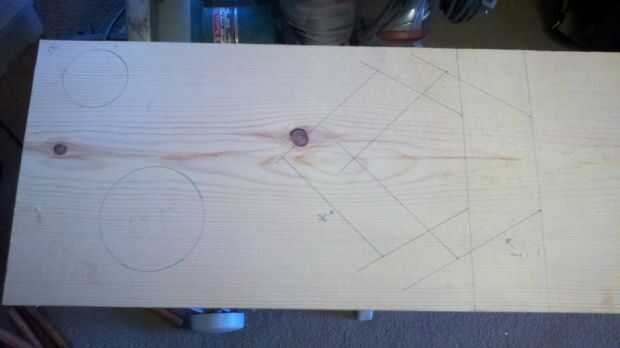 Siguiente fue la parte de trabajo de madera. Tengo que admitir - engañé un poco aquí, ya he utilizado algunas de mis viejas herramientas de redacción para diseñar la forma de Pentágono. Tomé una "T"-Plaza Vieja y a 45 grados y un triángulo de 30/60 grados para dibujar la forma. Utilicé una escala de 4" para las mediciones iniciales. Para los círculos, no puedo recordar lo que trazado alrededor, pero eran envases redondos de algo o otro. Estoy casi seguro de que el diseño de badajo fue extraído de la parte inferior de una lata de sopa...