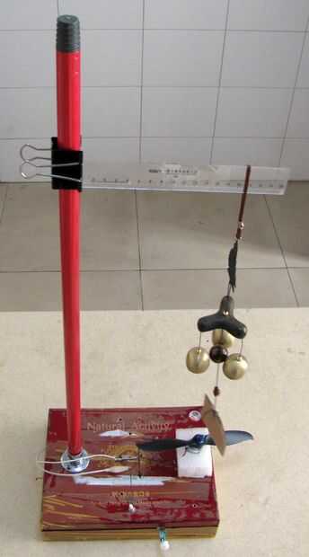 Foto 1: muestra todo viento chime mecanismo. Campana es una caja de puros con soporte de varilla de cortina sosteniendo una sección de la escoba con acrílico regla sujetada a la manija de la escoba con una pinza c de papel.