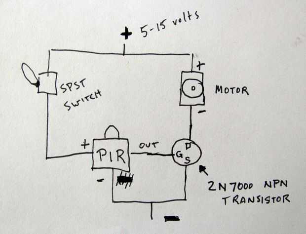 Foto 5: muestra cableado esquemático. Nota: probablemente debería usar un diodo conectado en los bornes del motor para proteger el transistor pero parece estar bien cuando se utiliza motor bajo del actual sin él.
