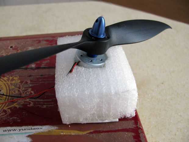 Foto 2: motor celebrado en algunos espuma de embalaje con adjunto hélice de un avión RC. Probablemente un fan más simple sería utilizar uno de esos sombrero solar accionado los fanáticos del béisbol. Lo importante es utilizar un motor de corriente baja - alrededor de 50 miliamperios. Si utilizas un 300 miliamperios motor el transistor no será capaz de arrancar el motor y las baterías no durará mucho tiempo.