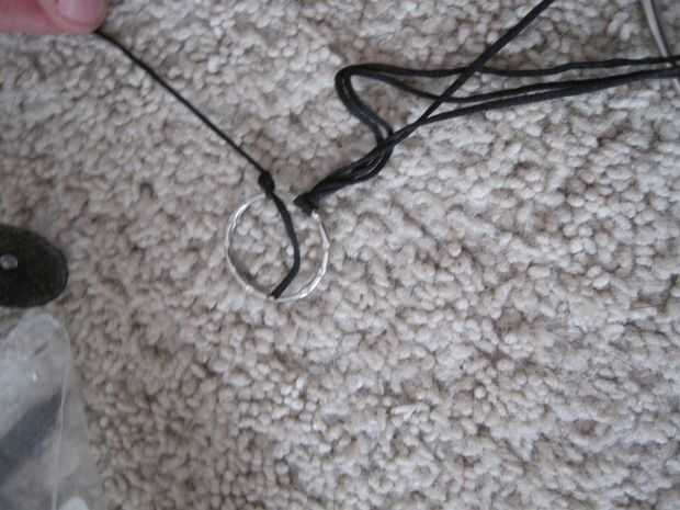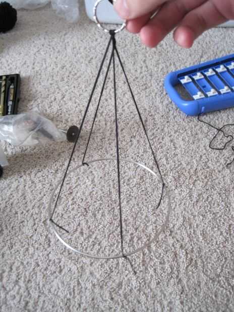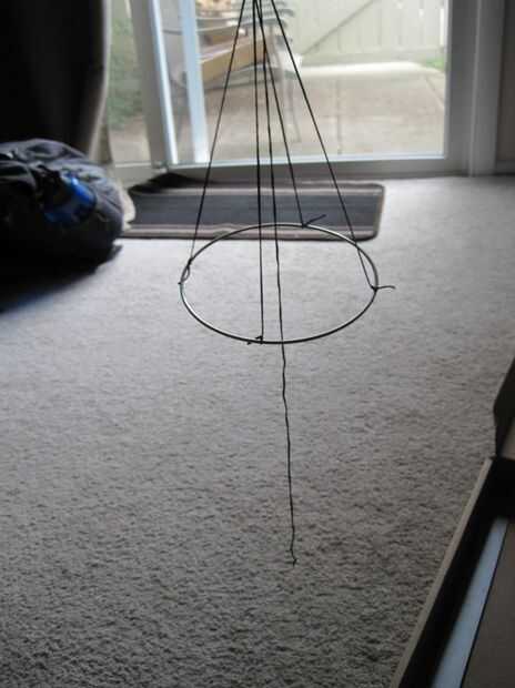 La dificultad de este paso está tratando de conseguir el anillo para colgar nivel como sea posible para que las campanadas suspendidas no se golpee o se enreden. Para hacer esto, que cortar las piezas de cuerda del mismo tamaño y había atado para el pequeño anillo y el anillo grande. Para realmente nivelar el anillo, envuelve el exceso de cordel alrededor del anillo más grande haciendo girar el nudo. Esto puso más cuerda en el anillo que permite el anillo grande a nivelarse. También estar atado a la argolla pequeña es la letanía de la chapaleta y colector.