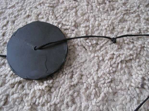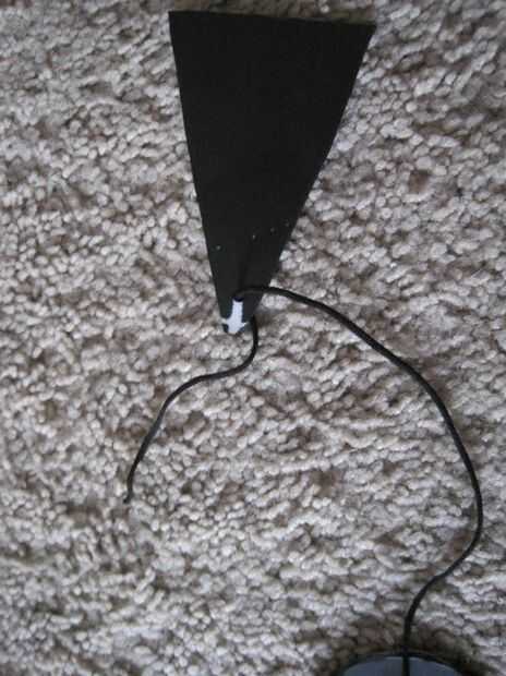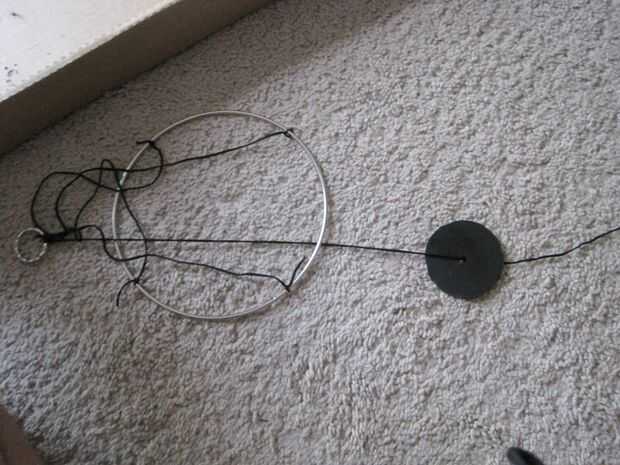 Alimentación la letanía mencionada en el último paso, el badajo y colector de piezas se unen a la campanilla. Te recomiendo conseguir la claqueta donde usted lo desee antes de colocar el colector. Una vez que la posición es correcta, atar un saber grande (o varios pequeños nudos) bajo la claqueta para asegurarlo en su lugar. Recorte el exceso de cordel de la parte inferior para conseguir la posición deseada para el receptor. Atar el captador de viento en la parte inferior de la cadena.