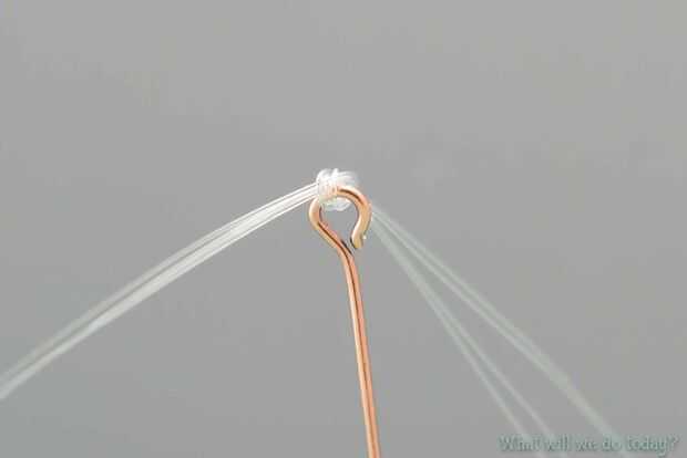 Tie cuatro pedazos de la línea de pesca a la vista del ojo abierto pin y recortar una línea a 1-1/4".  Cortar las otras tres líneas a 5/8".