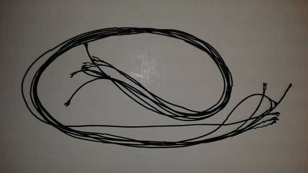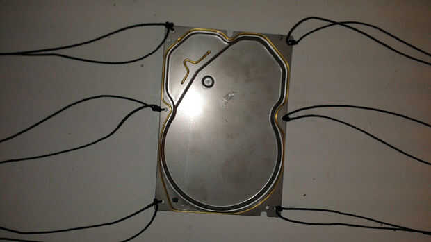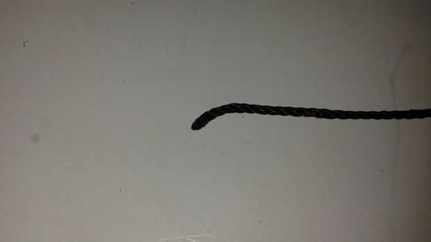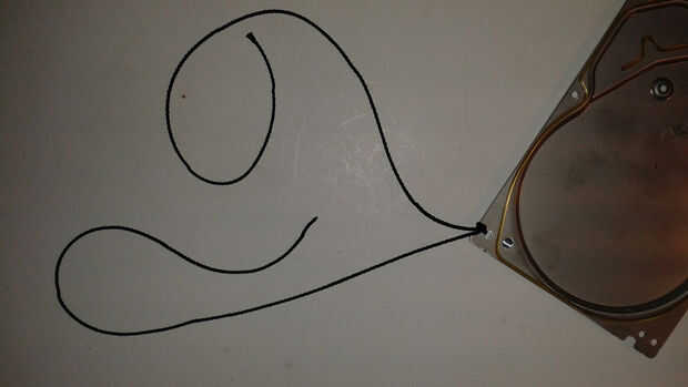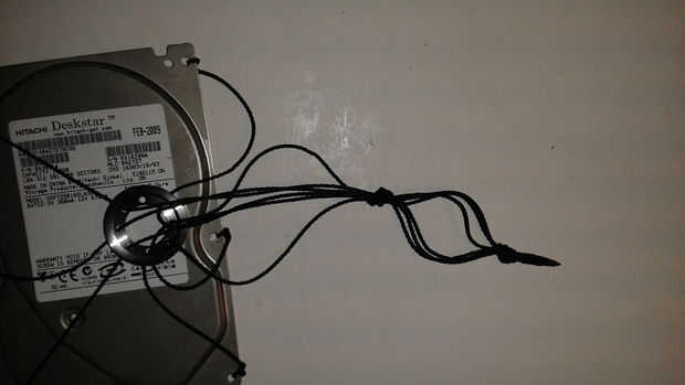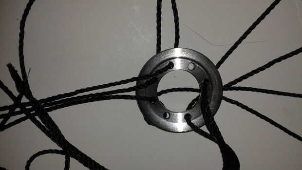 Primero corté seis longitudes de la cuerda a 30". Calienta el cada extremo de las cuerdas para fundirlo y evitar que desentrañar. Até cada cuerda en el medio a través de cada uno de los agujeros de montaje exterior de la cubierta de la unidad. Rosca una mitad de cada cuerda por un agujero independiente en el anillo de montaje de disco entonces atados les para la cubierta colgaría levelly. Até a otro nudo en las cuerdas un poco más arriba para crear un bucle para colgar las campanadas. Me corte el exceso de cordel y utilizar un encendedor para impedir el colapso.