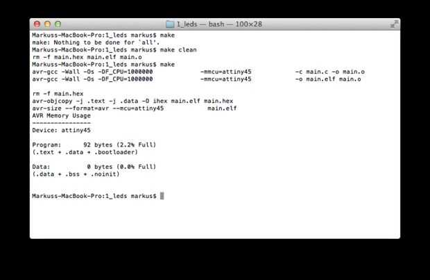 No queremos hacer todos los pasos de compilación, enlaces, etc. a mano así que lo primero que necesitamos es un Makefile. Si utilizas Crosspack AVR en os x, puede utilizar el comando avr-proyecto en el Terminal que crea automáticamente un archivo make para nosotros (y para un proyecto de XCode que no necesitamos por lo que se puede borrar). De lo contrario, puede utilizar la siguiente plantilla para su Makefile. Tenga en cuenta que debe modificar las primeras líneas de esta plantilla para su propia configuración (es decir, establecer las variables de dispositivo y programador).