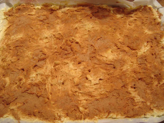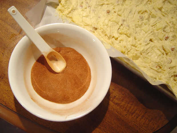 Mezclar 2 cucharadas de azúcar (este no es lugar para Splenda!) y dos cucharaditas de canela en un tazón. Con cuidado espolvorear esta mezcla sobre toda la superficie uniformemente como sea posible.